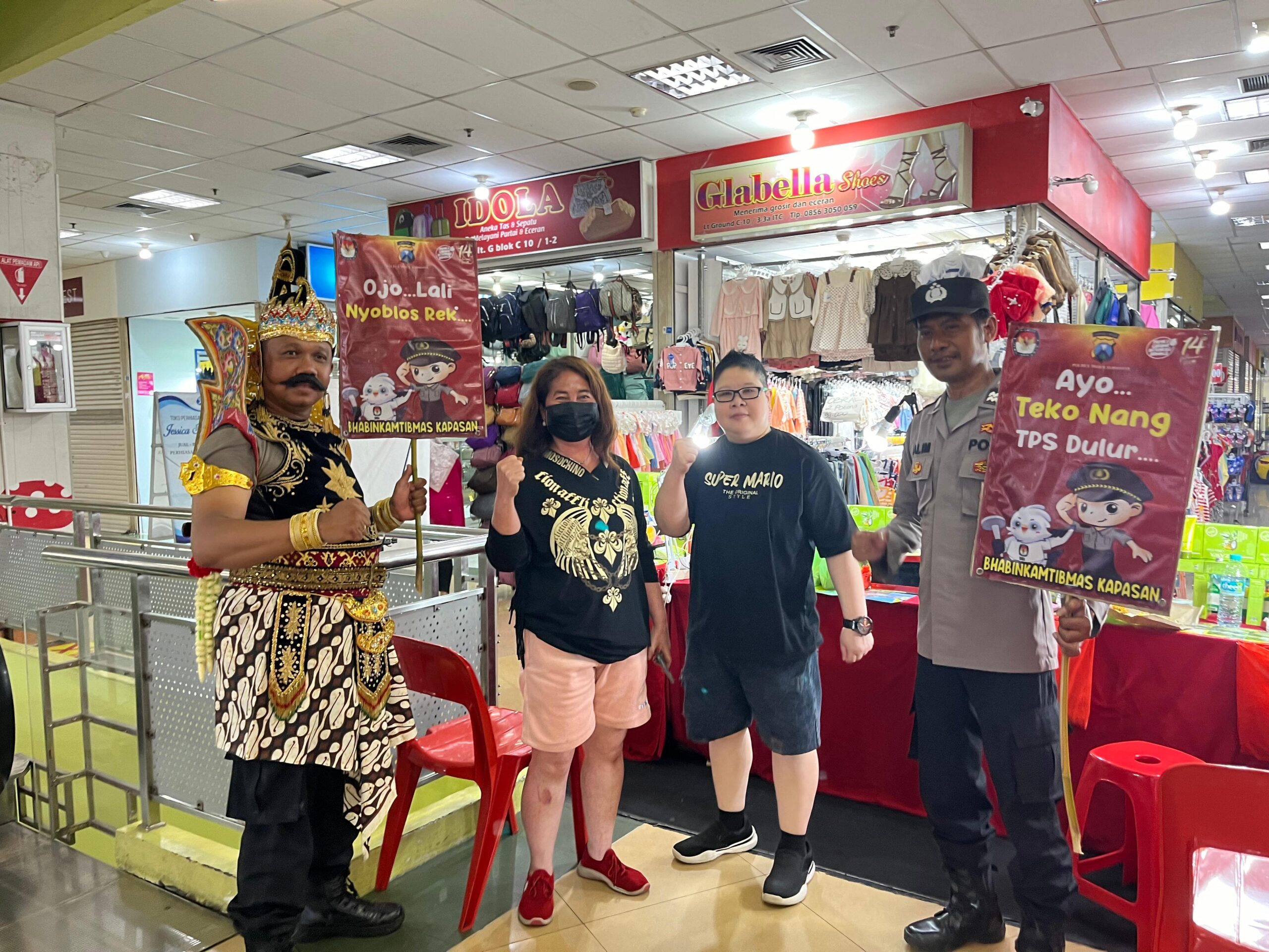 Mereka tampak menyambangi Pasar Kapasan dengan menggunakan kostum Gatotkaca menyapa dan mengedukasi pengunjung untuk tak golput.