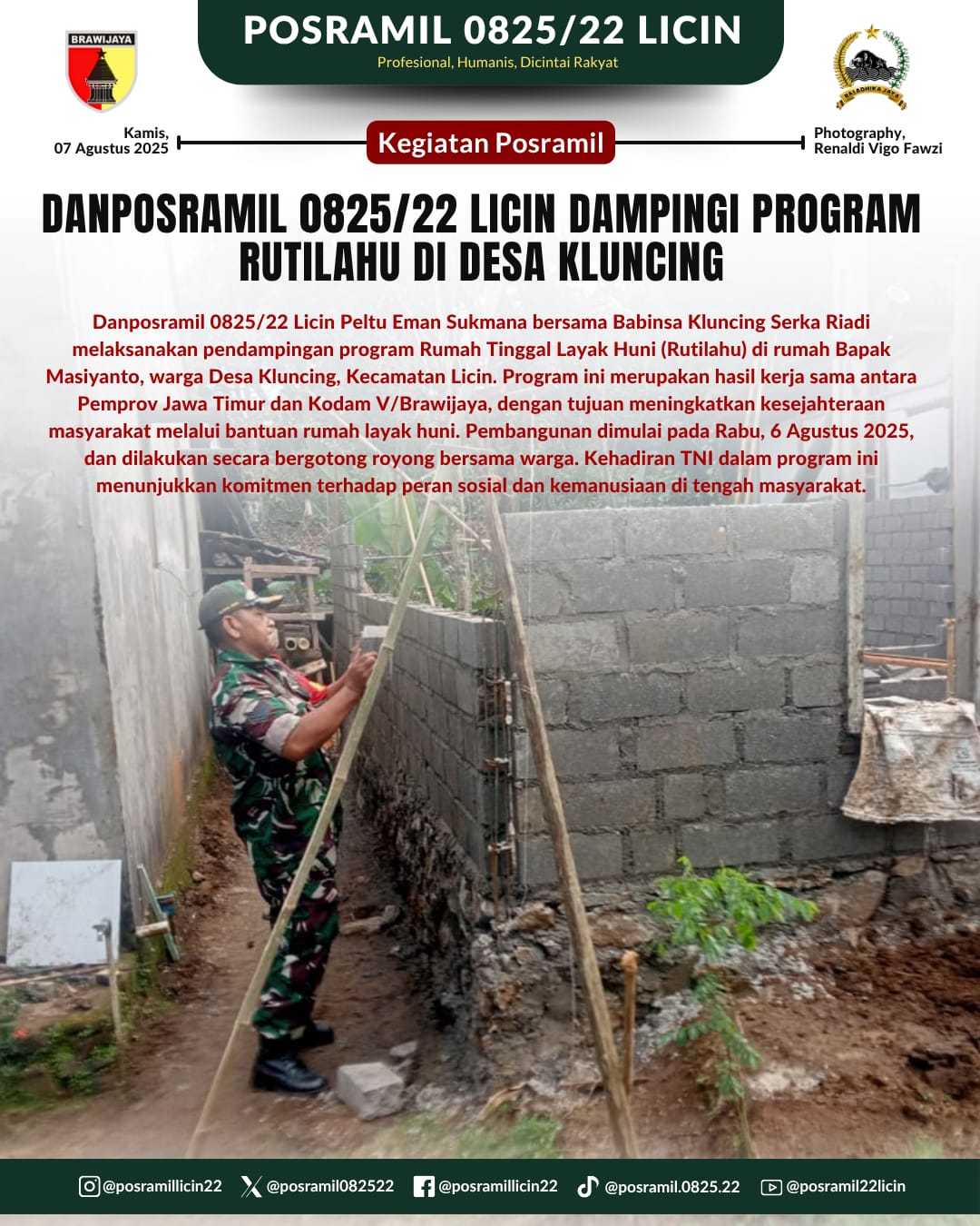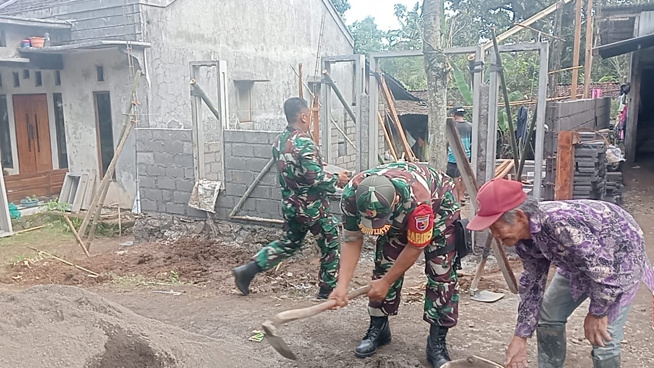BANYUWANGI, Actanews.id – TNI kembali menunjukkan peran aktifnya dalam mendukung program sosial kemasyarakatan. Danposramil 0825/22 Licin, Peltu Eman Sukmana, bersama Babinsa Desa Kluncing, Serka Riadi, turut mendampingi pelaksanaan program Rumah Tinggal Layak Huni (Rutilahu) di kediaman Bapak Masiyanto, warga Dusun Krajan, Desa Kluncing, Kecamatan Licin.