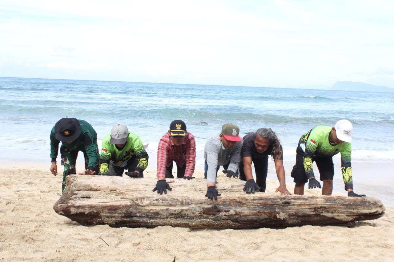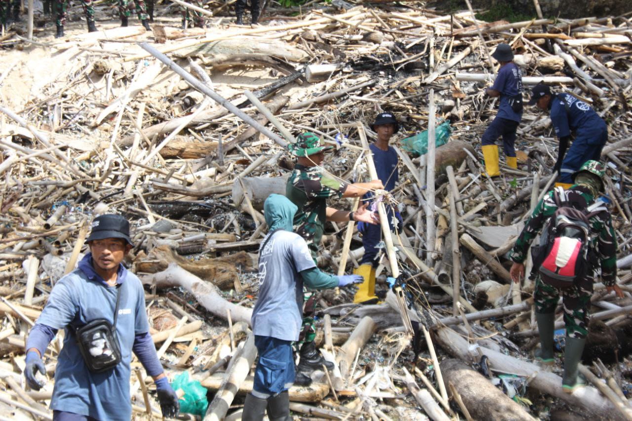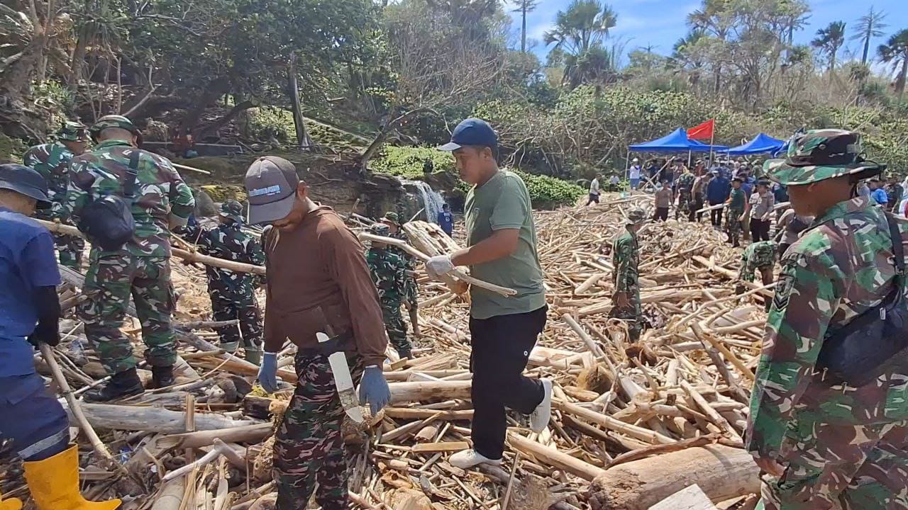 Dengan peralatan sederhana, prajurit TNI dan warga memunguti serta menyingkirkan sisa-sisa kayu demi mengembalikan keindahan pantai agar tetap bersih, aman, dan nyaman bagi masyarakat maupun wisatawan yang berkunjung.