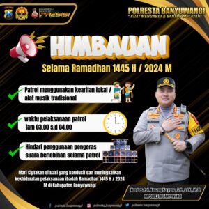 Oleh sebab itu, dalam menjaga suasana tetap aman dan nyaman selama Ramadan, Polresta Banyuwangi menyampaikan beberapa imbauan berkenaan dengan aktivitas patrol.